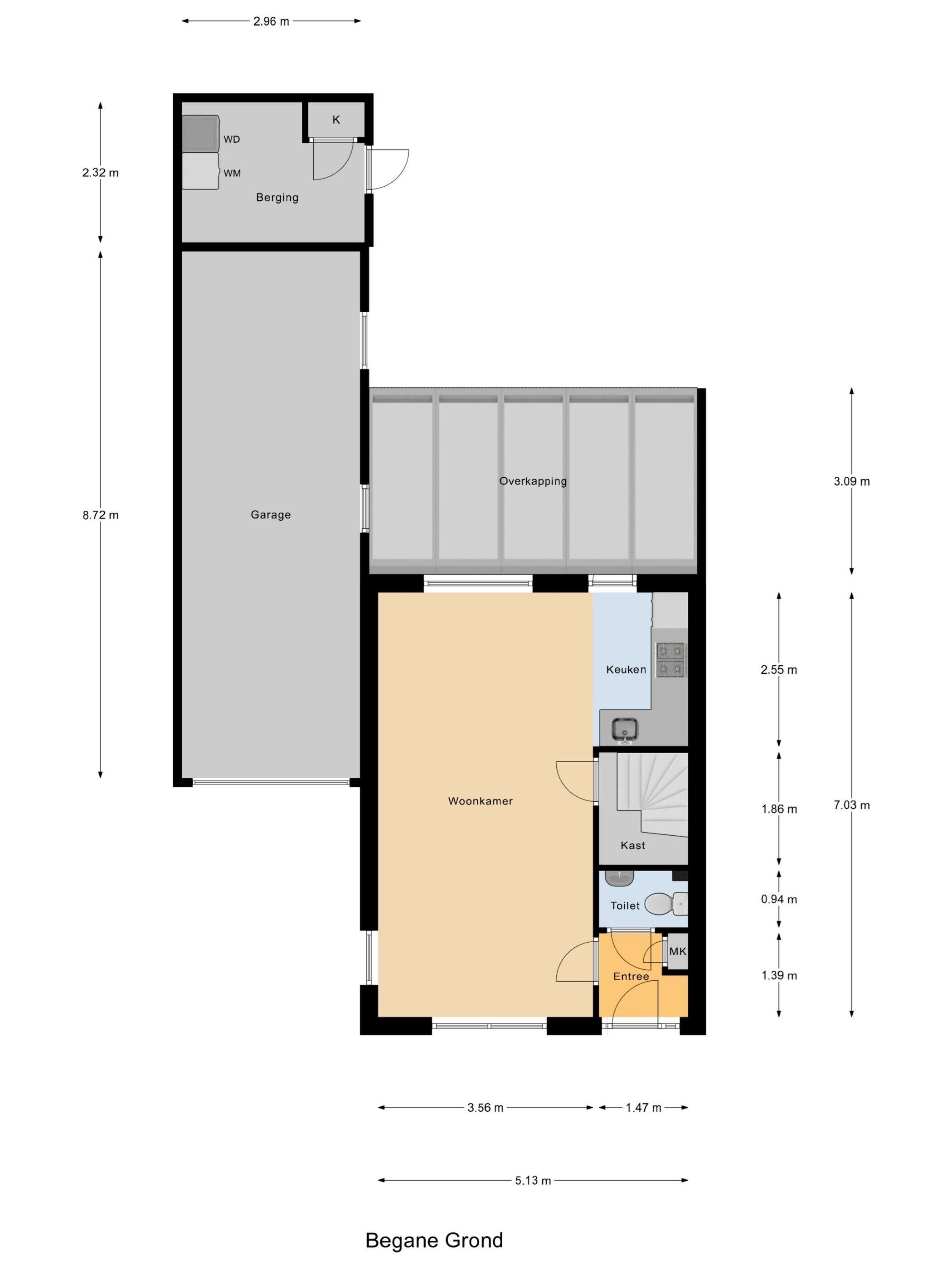 De woning heeft een eigen oprit met plaats voor meerdere auto’s en een garage met elektrische deur. In de hal vindt u de trap naar de eerste verdieping, de meterkast en het toilet. Verder bestaat de begane grond uit een L-vormige woonkamer met open keuken.
