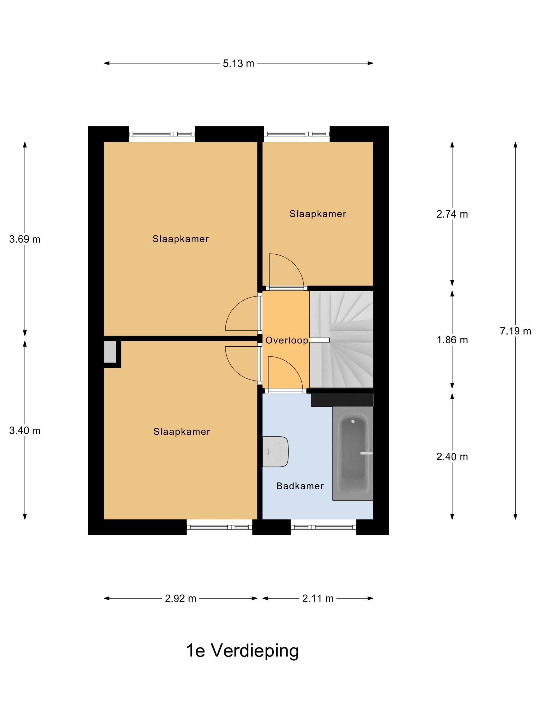 De eerste verdieping bestaat uit de overloop met een vaste trap naar de tweede verdieping, 3 ruime slaapkamers en de badkamer. De badkamer is voorzien van een ligbad en wastafel.
